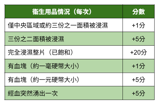 計算方法:每次更換衞生用品時,當經血只浸濕衞生用品約三份之一的面積,加1分;浸濕三份之二面積時,加5分;完全浸濕整片衞生用品,加20分。而若衞生用品上留有血塊,且大小如一毫硬幣,多加1分;如果大小如一元硬幣,則加5分。若出現經血湧出現象,每次加5分